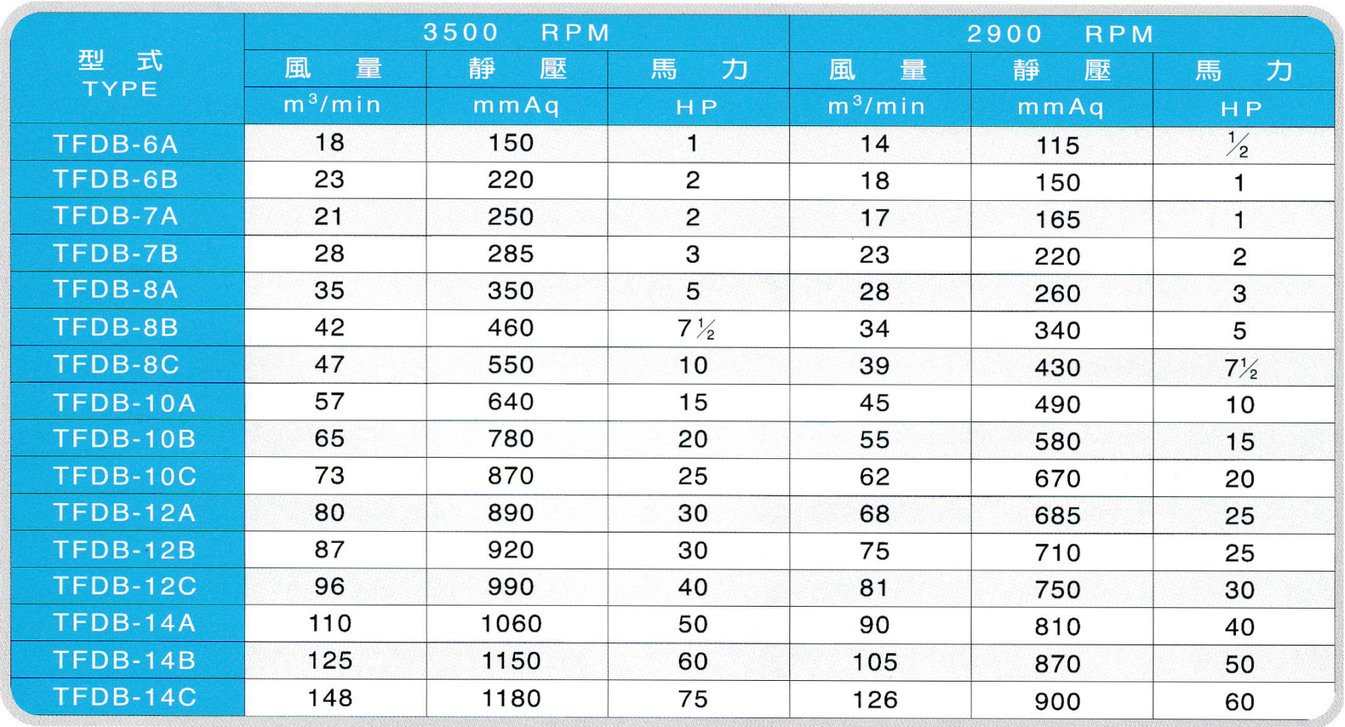 本機為高壓透浦式馬達直結驅動型其靜壓較TFD-A為高,構造堅實佔地小,效率高,適用於飼料、麵粉、塑膠廠之粉粒體收集及氣體輸送皆廣採用。