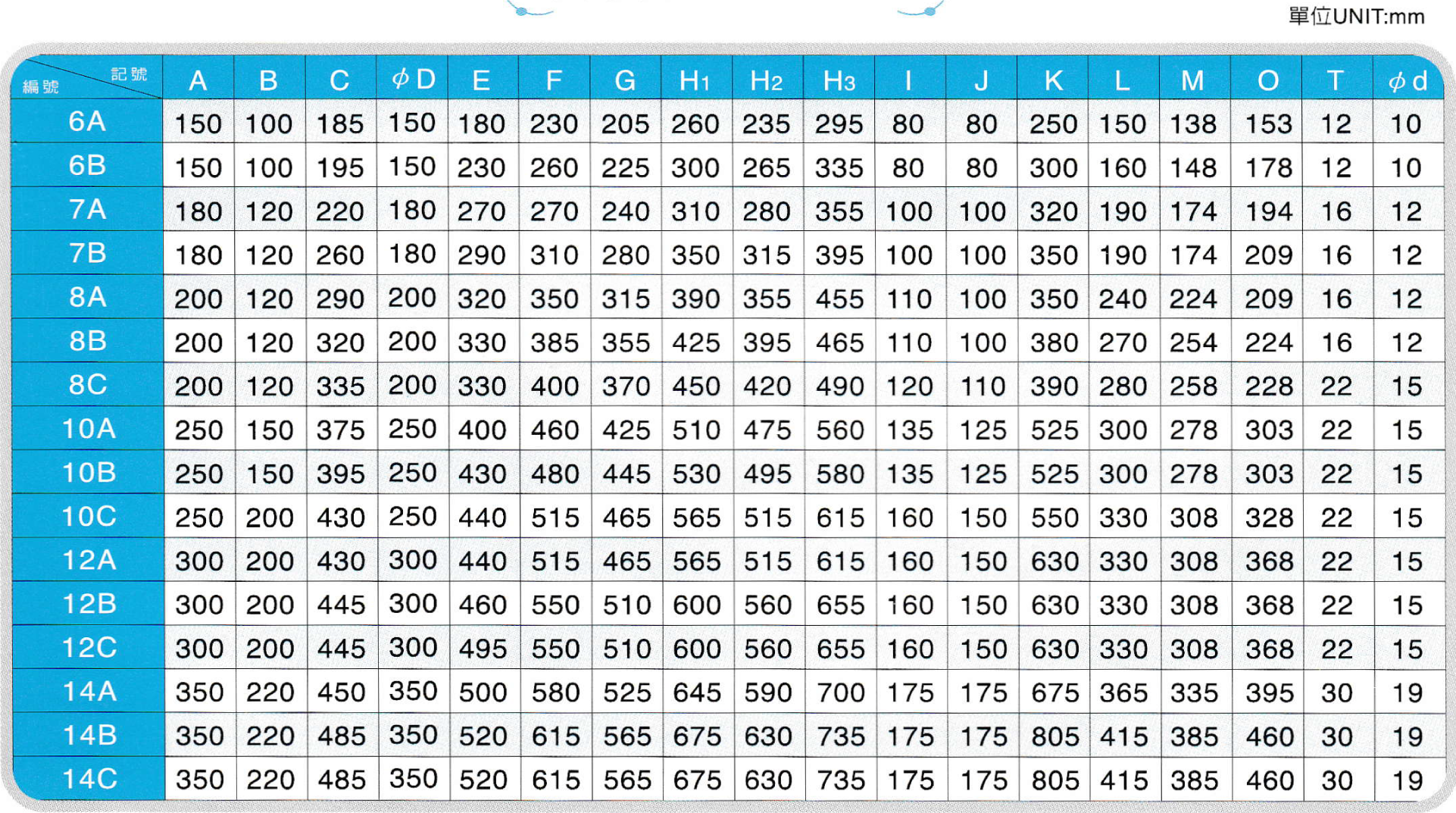 尺寸表Dimensions
